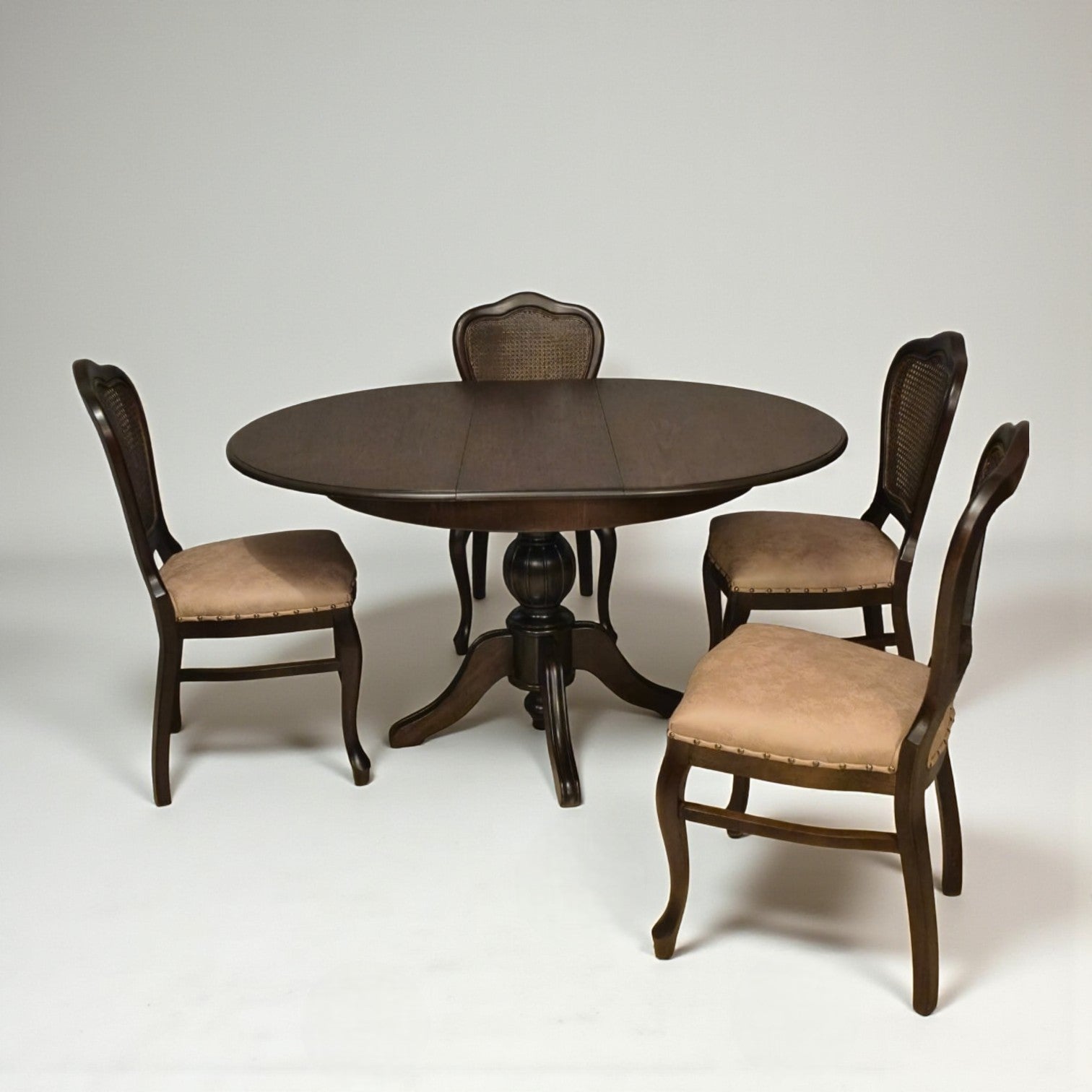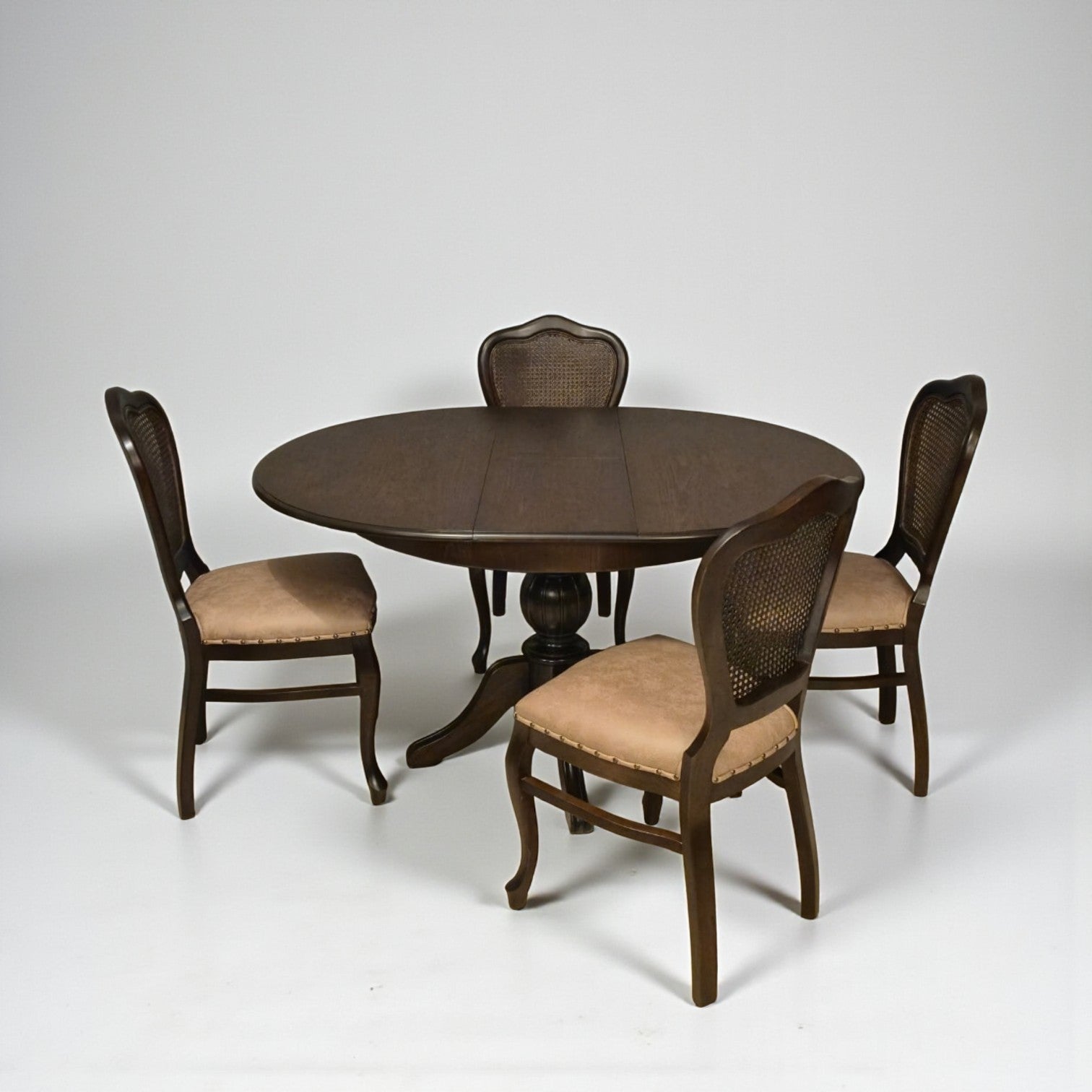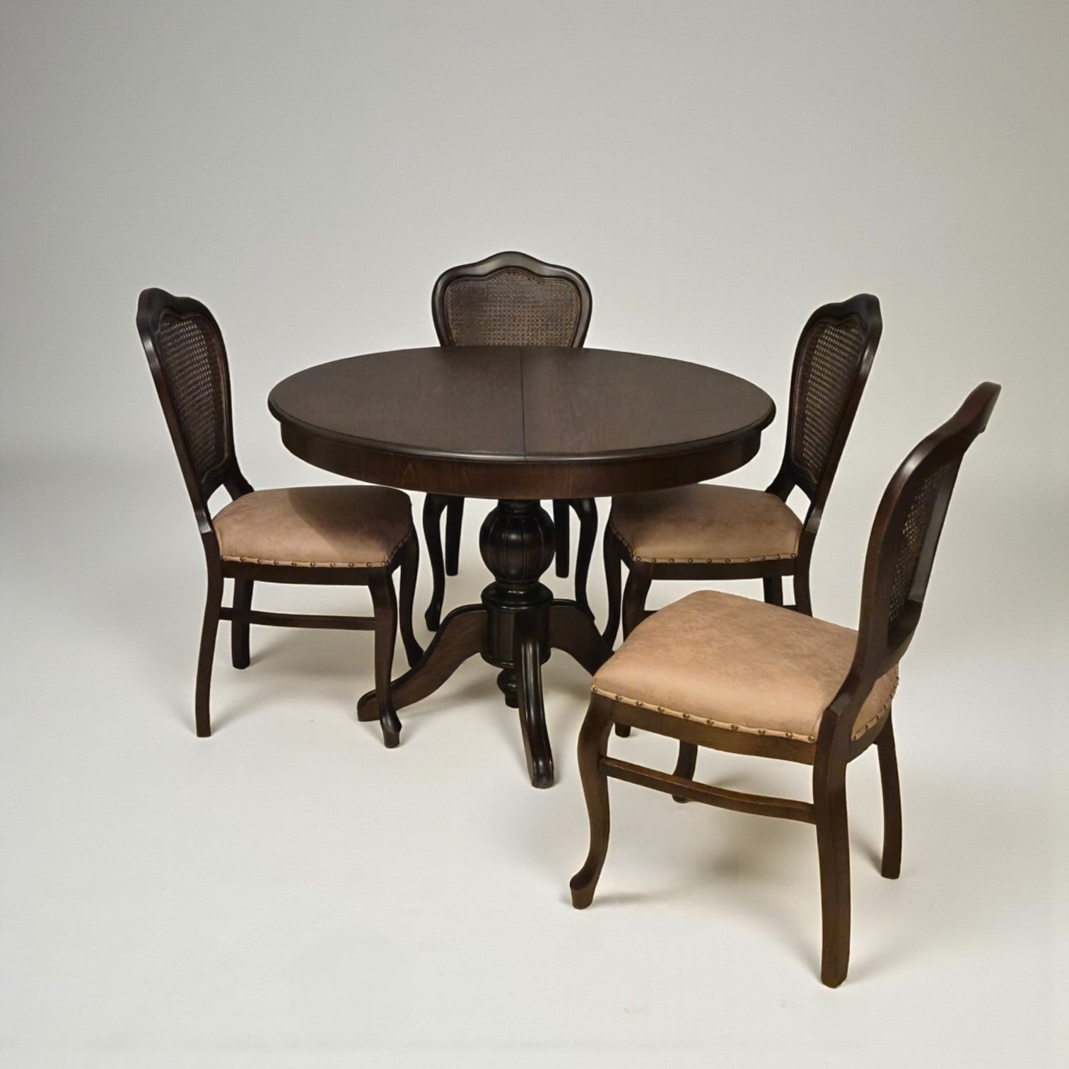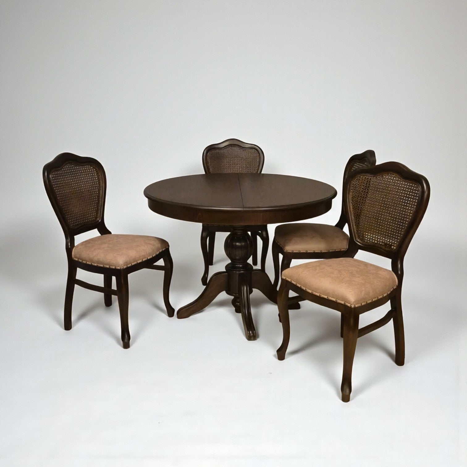 Zarafetiyle göz dolduran, klasik estetiğin güçlü bir yorumu… Elegansia Açılır Yuvarlak Masa Takımı, ince işçilikle şekillendirilmiş gövdesi ve dengeli yuvarlak formuyla bulunduğu alana sofistike bir hava katıyor. Geleneksel detaylar ve modern uyumun buluştuğu bu özel tasarım, zamansız bir şıklık sunuyor.
