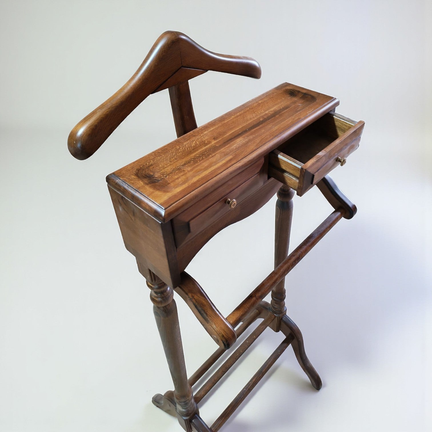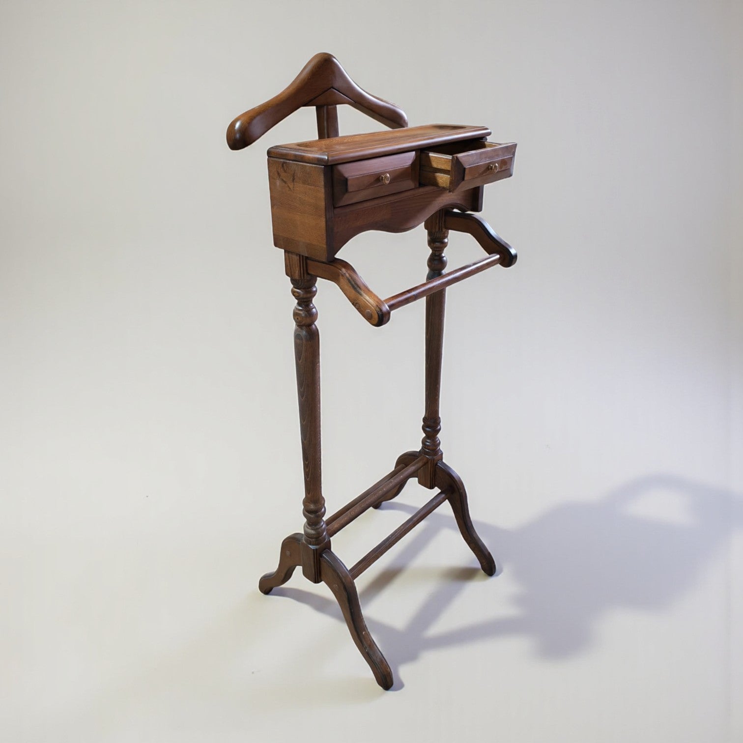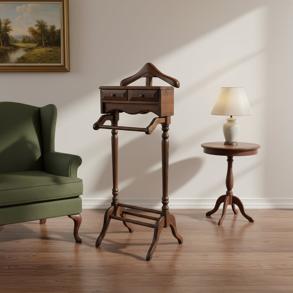 Masif ahşaptan üretilen Castel Dilsiz Uşak, klasik formu ve dengeli oranlarıyla yatak odası ya da giyinme alanlarında zarif bir tamamlayıcıdır. Üst askı bölümü ceket ve gömlekler için ideal kullanım sunarken, zarif yapılı iki çekmecesi ise saat, cüzdan, kemer ve kişisel aksesuarlarınız için düzenli bir saklama alanı oluşturur.