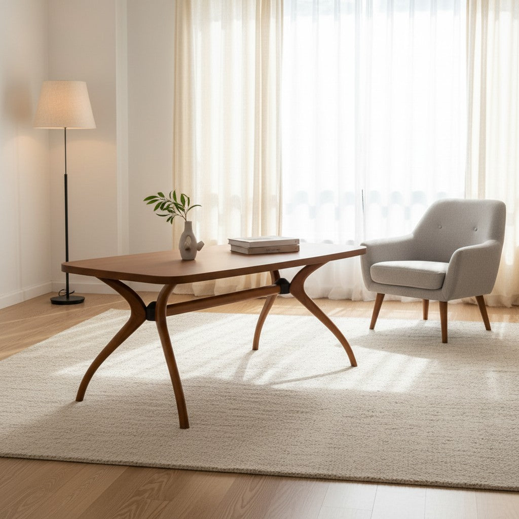 Masif ahşap gövdesi sağlamlık sunarken, kavisli taşıyıcı detaylar tasarıma heykelsi bir etki kazandırır.