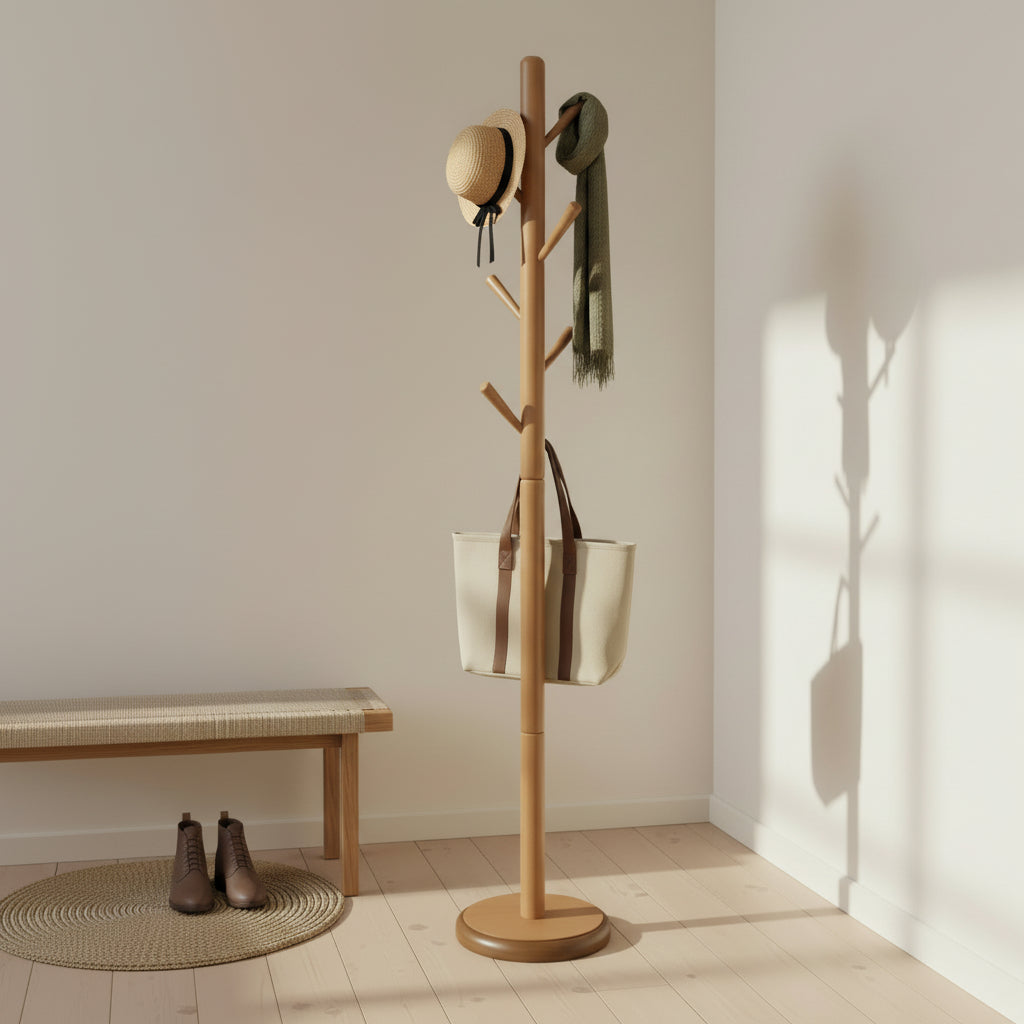 Verde Ahşap Askılık dengeli yapısı sayesinde ceket, çanta ve aksesuarlarınızı güvenle taşıyabilir. Minimal tasarımı bulunduğu mekâna ferah bir görünüm kazandırırken, işlevselliğiyle günlük kullanımda pratik bir çözüm sağlar.